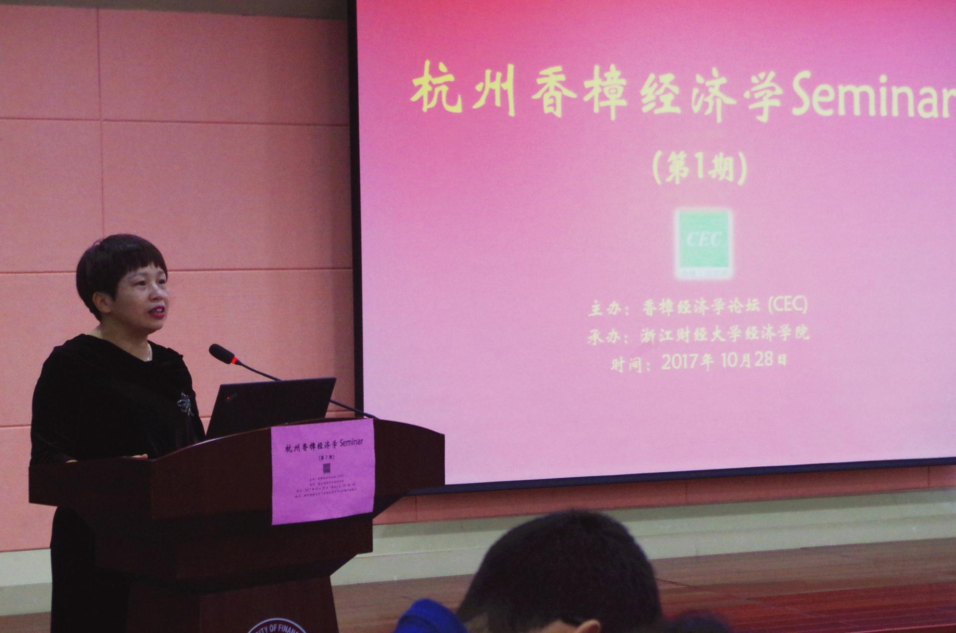 经理胡亦琴教授出席开幕式并致辞,强调举办杭州香樟经济学Seminar(第1期)是深入学习贯彻党的十九大精神,讨论和交流参会人员研究中国经济热点问题最新成果的良好契机,并借用今年诺贝尔经济学奖得主理查德•塞勒的“助推”理论,希望杭州香樟经济学Seminar(第1期)是一个良好的开端和一场有效的实验,“助推”参会的青年经济学学者和员工做出更好的学术成果,“助推”浙江各兄弟高校青年经济学者之间,以及与全国各大高校青年经济学之间加深学术交流,加快学术合作,为中国经济学理论发展和经济发展做出我们经济学人的贡献。