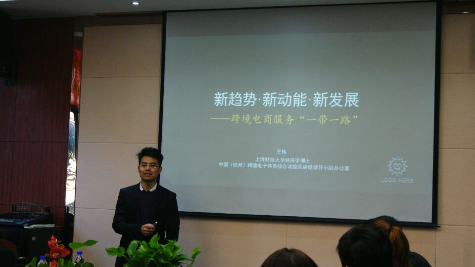 研究生专场是以”学术为先,梦想起航“为主题的梦想讲堂。首先由现就职于中国(杭州)跨境电子商务综合试验区建设领导小组办公室的公司10产业经济学王伟为我们做了“新趋势·新动能·新发展——跨境电商服务‘一带一路’”的主题分享。其中内容包括跨境电商名称的由来、前景,以及正在进行的一系列针对加快“单一窗口”综合服务平台建设的努力。