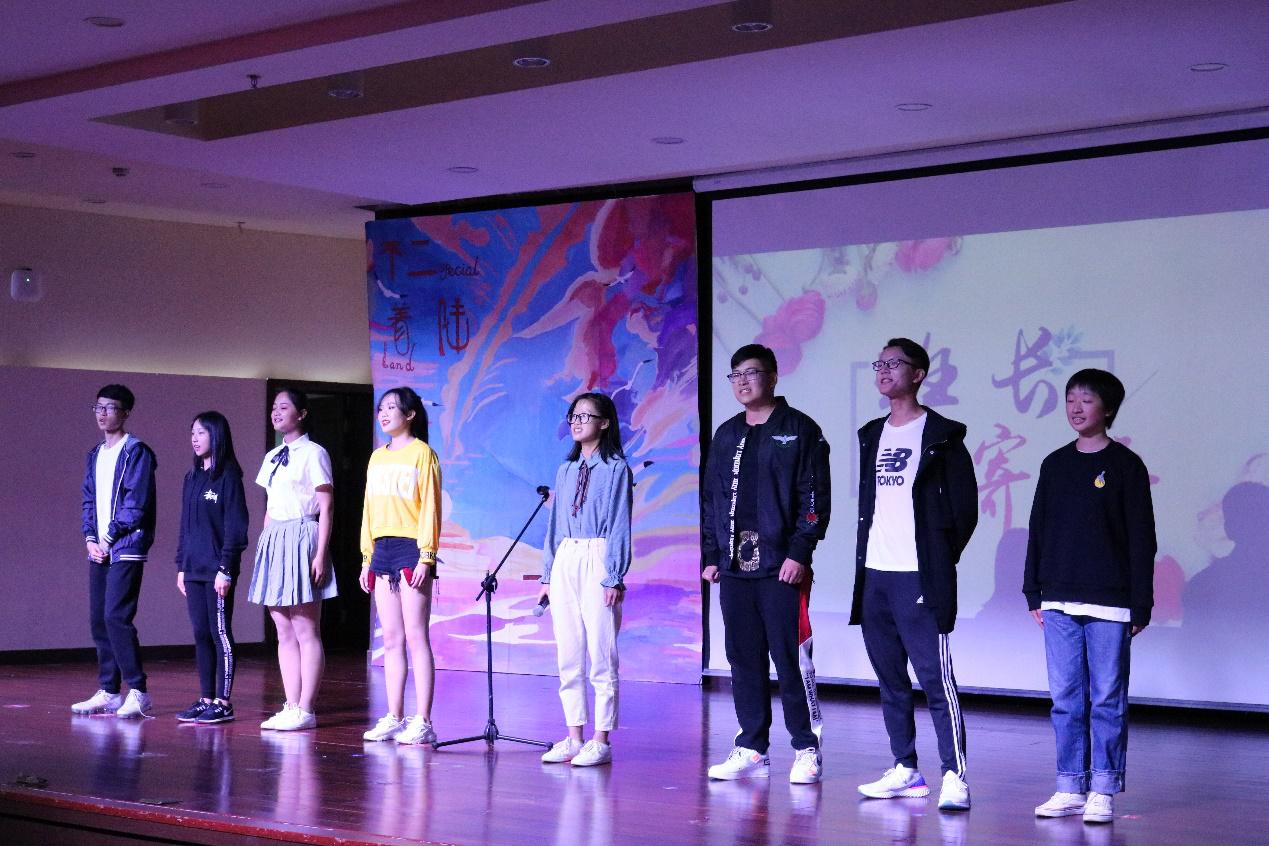 晚会以“不二着陆”为主题,所有节目以班级为单位展开,每一位同学既是观众,同时也是表演者。晚会由艺术团带来的《爆炸的佩奇》拉开帷幕。18经贸1班带来的影子剧+朗诵《和平之唤》以美好爱情开头,以残酷战争结尾,巨大的反差唤起人们对和平的珍视与思考。接着,18经贸3班带来了歌舞《Try》,歌声甜美,舞蹈热辣。