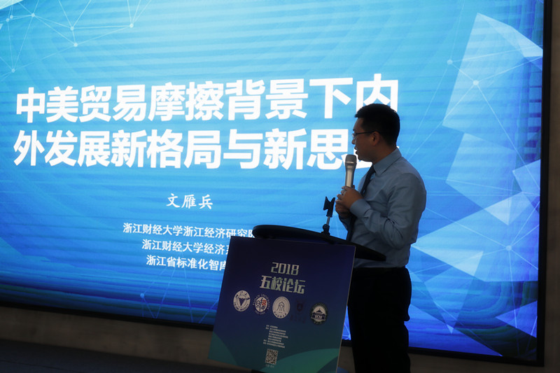 “2018国际贸易理论与中国现实问题五校论坛”主题为“贸易摩擦、经济大势与中国改革开放新态势”,共举行了改革开放策论、高端对话和论文研讨三个环节的学术交流和政策研讨活动。在改革开放策论环节,公司文雁兵副教授作了题为“中美贸易摩擦背景下内外发展新格局与新思路”主旨报告。在论文研讨环节,来自浙江大学国际经济研究所、复旦大学世界经济研究所、公司浙江经济研究院、南京大学国际贸易系、武汉大学世界经济系20余位青年学者和博士生报告了12篇国际贸易理论与应用领域的最新学术论文,公司沈鸿博士报告了题为《全球价值链嵌入位置与制造企业成本加成:贸易上游度视角的实证研究》一文,文雁兵副教授还与合作者报告了题为《国际标准认证与中国企业出口:理论与实证》一文。