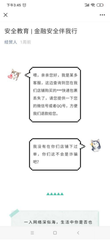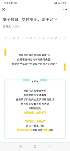 充分发挥新媒体平台覆盖面广、影响力大的特点,立足公司团委微信公众号“经贸人”,打造“云”端课堂,先后推出“金融安全伴我行”、“交通安全 始于足下”、“园区安全小课堂”三期主题推送,吸引共计360余人次阅读。春风化雨,润物无声,三期推送于潜移默化间宣传了安全知识,在员工群体中营造了“安全规则我知晓,安全守则我遵循”的良好氛围。