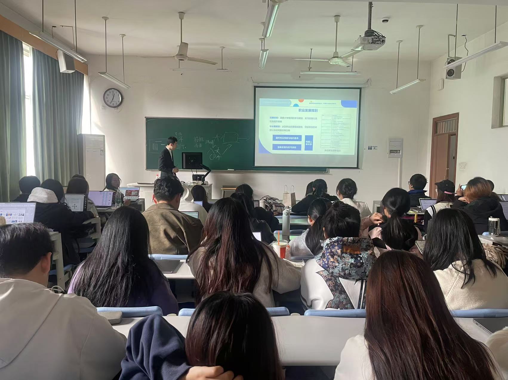 专家凭借丰富的经验,向同学们介绍了规划书的结构框架与内容要点。从自我评估、职业目标设定,到实施计划与评估反馈,每一部分都辅以实际案例进行生动阐释,让同学们迅速掌握了撰写的精髓,确保规划书既具逻辑性又有可操作性。同学们积极提问,围绕职业目标迷茫、专业与职业不对口等问题展开深入探讨。专家与嘉宾们耐心解答,为同学们排忧解难,现场气氛热烈而融洽。