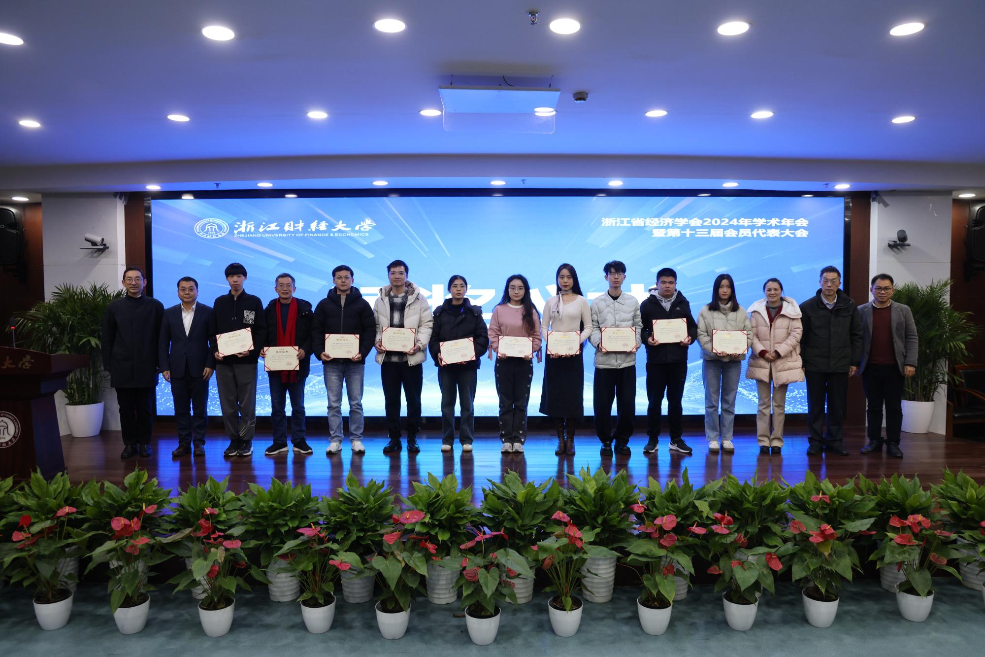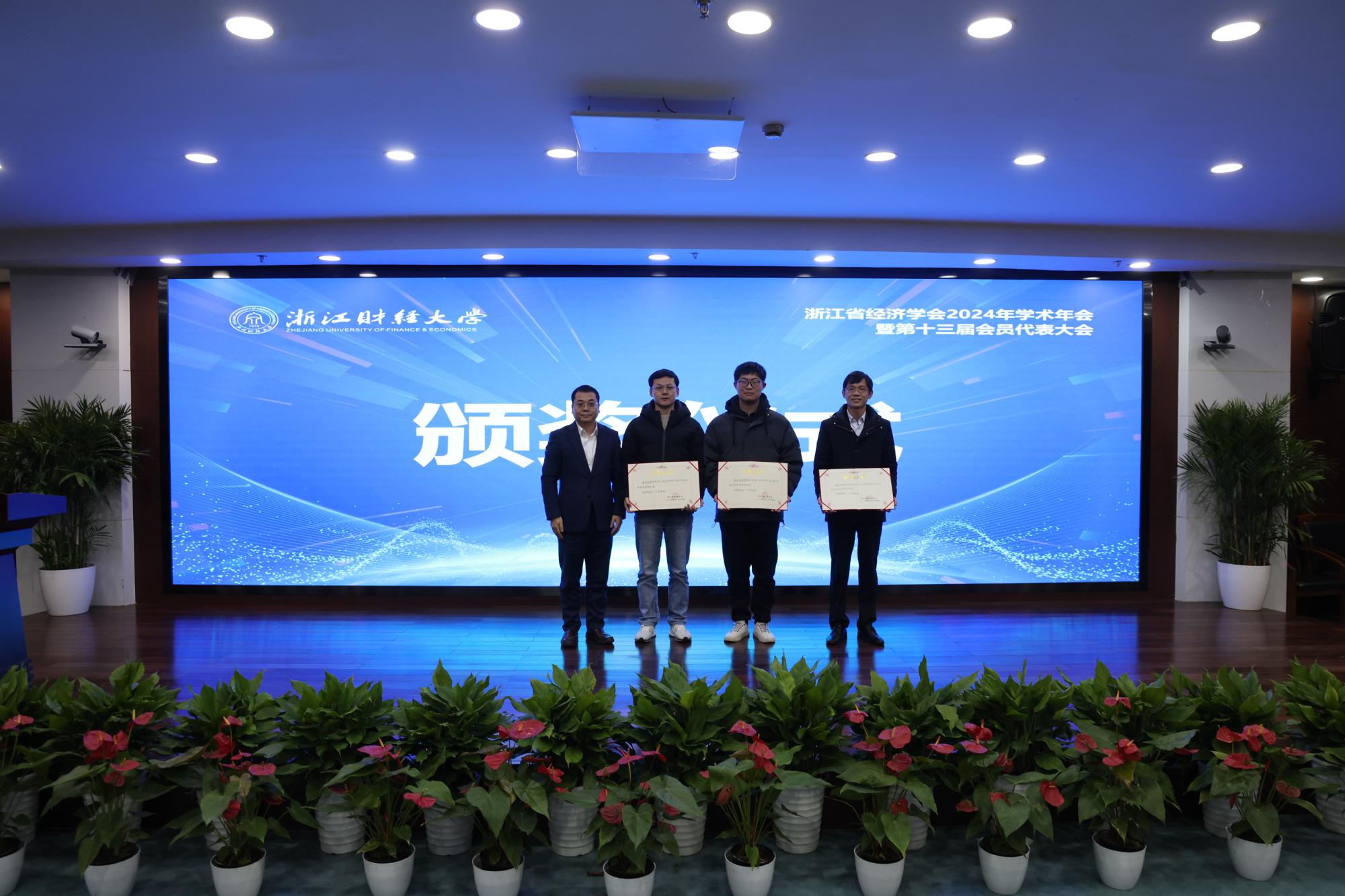 在闭幕式环节,举行了2024年度浙江省经济学会优秀成果、优秀论文、优秀组织奖的颁奖仪式。浙江省经济学会第十三届理事会会长潘士远教授对本次年会进行了总结,介绍了新一届理事会领导及工作思路,并对本次年会的组织工作进行了充分肯定。省经济学会理事会副会长周新苗教授代表下一届省经济学会学术年会的承办方宁波大学作邀请发言。最后,闭幕式主持人、省经济学会理事会秘书长叶兵对各位参会嘉宾、学会同仁与同学们表示衷心感谢,并宣布浙江省经济学会2024年学术年会胜利闭幕。