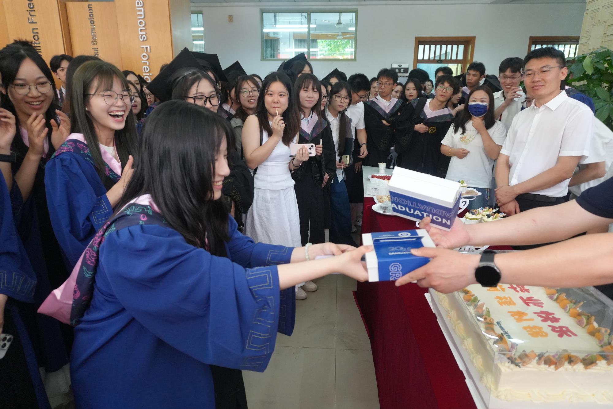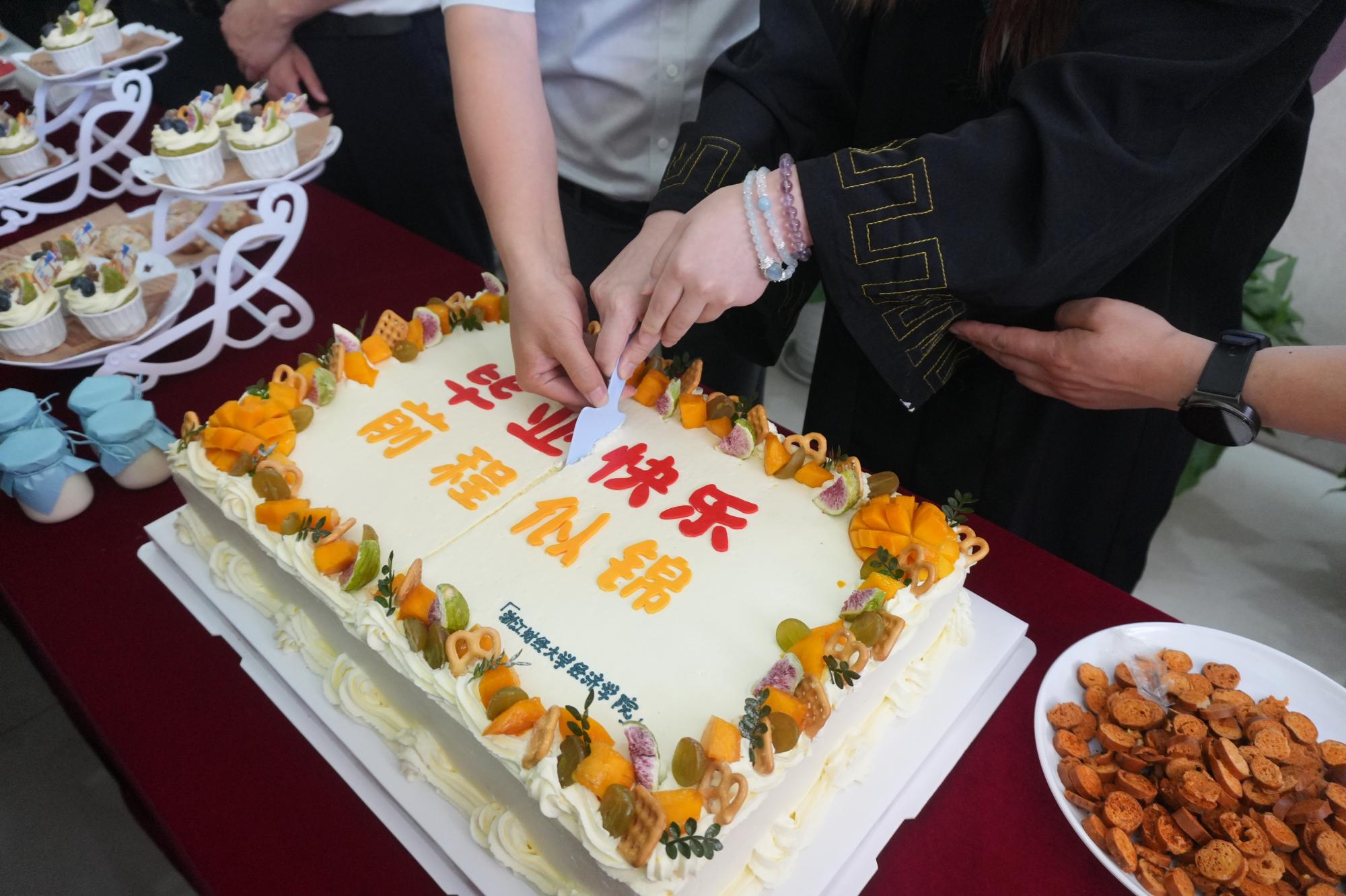 公司举办温馨毕业仪式,师生齐聚一堂,以共切毕业蛋糕的方式为青春献礼。仪式现场,毕业蛋糕造型精美,奶油上“毕业快乐,前程似锦”的祝福字样格外醒目。经理罗俊与当天过生日的毕业生查诗莹共同执刀,切开象征成长与收获的蛋糕。师生们相互传递甜蜜,在欢声笑语中分享这份承载着回忆与期许的美味。随后,公司党委书记徐奇伟为毕业生代表颁发精心准备的毕业礼物,每一份礼物都饱含着公司对学子的深情牵挂。这场充满仪式感的活动,让毕业生们在离校之际深切感受到“经院大家庭”的温暖。