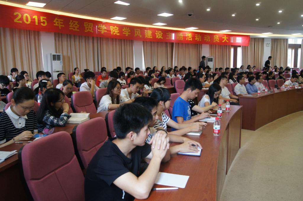 9月22日下午2点,经贸公司2015年学风建设主题活动动员大会暨五星级课堂启动仪式在6号楼219教室顺利举行。公司党总支书记范建锋、副书记叶秀、教师代表文雁兵、黄禾雨、崔轩玮、麦正锋、刘毅群、全体辅导员、本科生代表、研究生代表共计两百余人参加了此次活动。