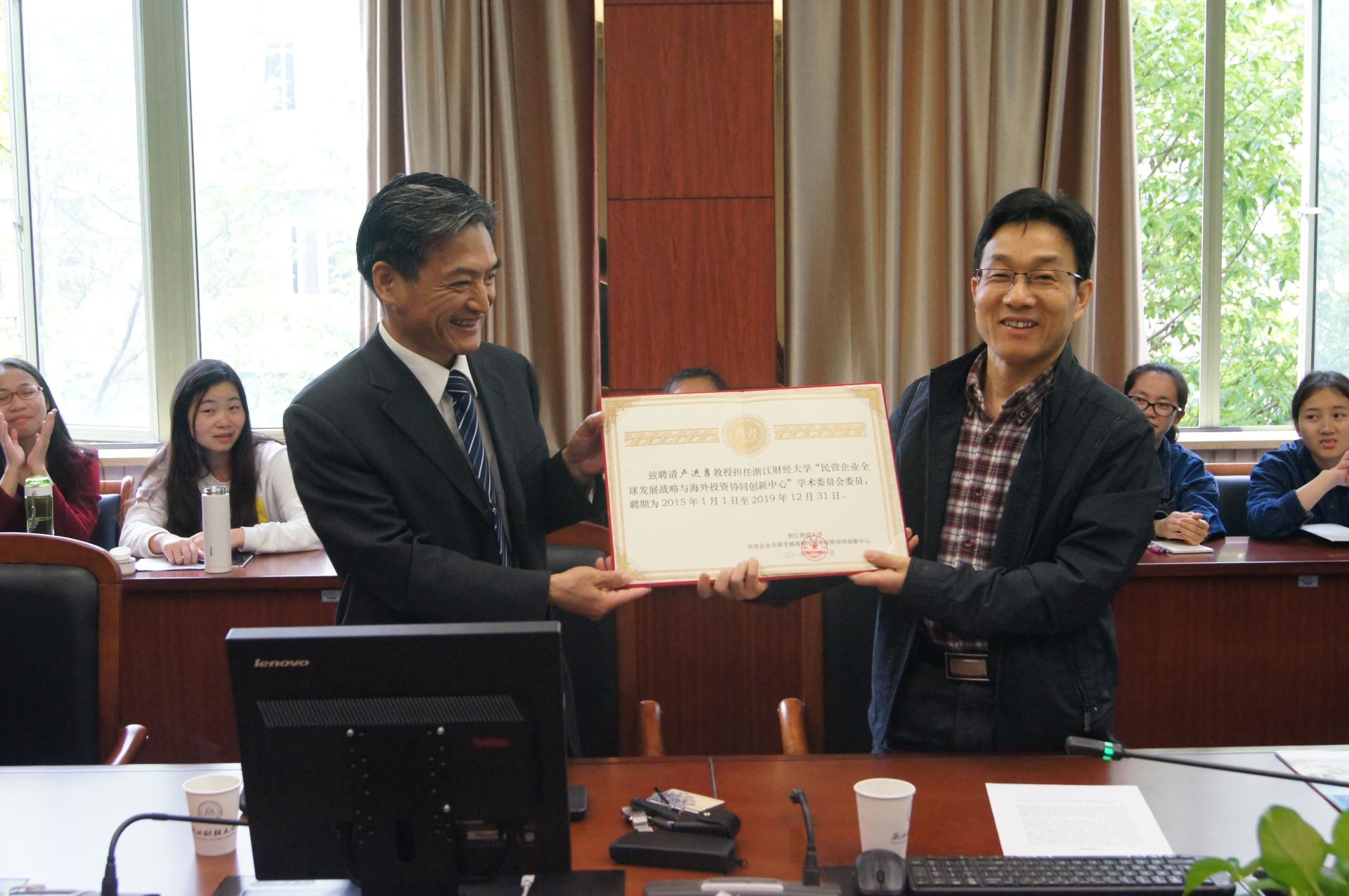讲座开始前,举行了聘任仪式,聘请卢进勇教授为公司民营企业全球发展战略与海外投资协同创新中心学术委员会委员,卢新波副书记为卢教授颁发了证书。