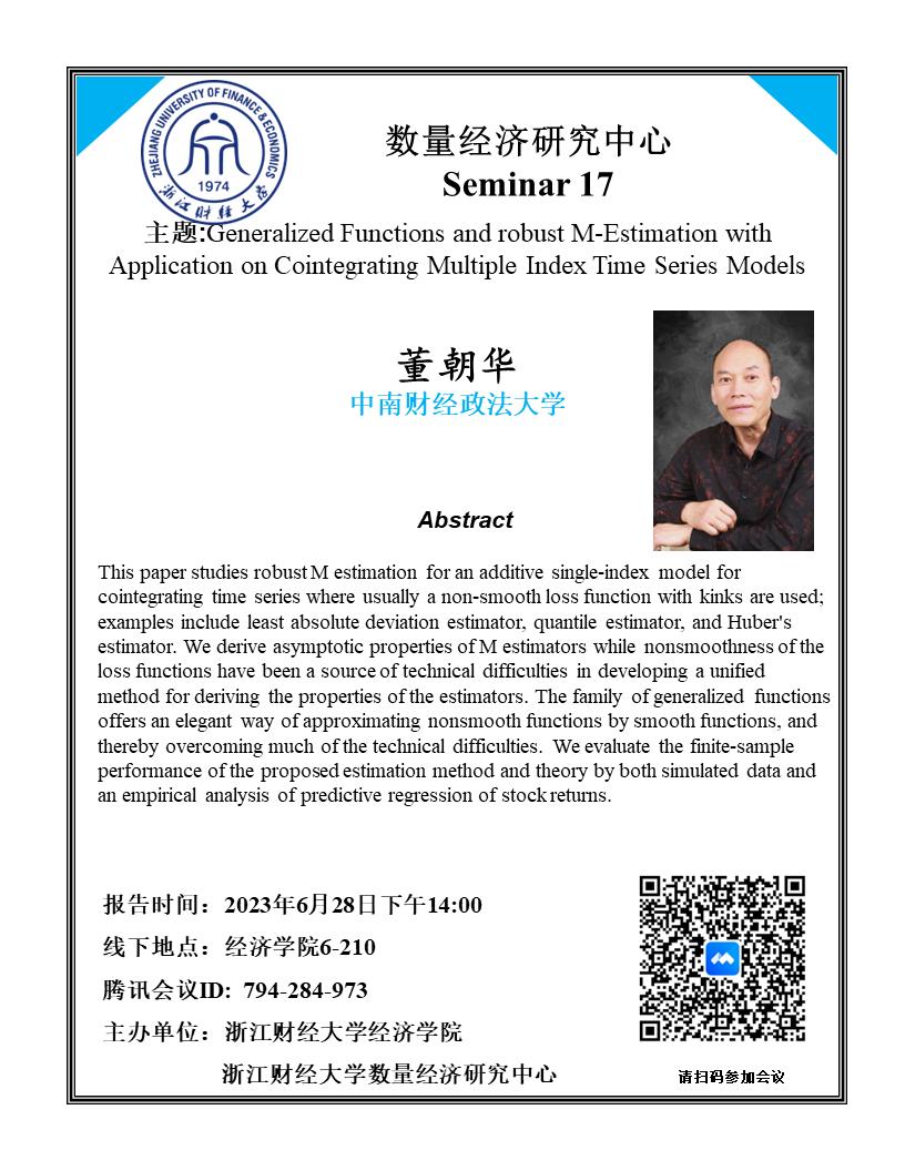 董朝华,中南财经政法大学统计与数学公司教授,主要研究领域为高维计量理论、非参数与半参数方法、非平稳时间序列和面板数据模型、微观计量应用,其研究成果发表在Journal of Econometrics、Journal of Business and Economic Statistics、Econometric Theory、《系统工程理论与实践》等国内外一流经济学期刊,主持多项自然科学基金,中国系统工程学会金融系统工程专业委员会理事,并担任Journal of Econometrics, Econometric Theory, Econometric Reviews, Annals of Statistics, Journal of Business and Economic Statistics等期刊匿名评审员。