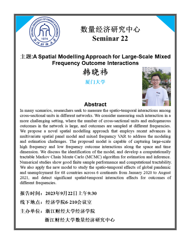 主讲人简介:韩晓祎,2014年获美国俄亥俄州立大学经济学博士,现为厦门大学王亚南经济研究院与经济学经理聘副教授、博士生导师,主要研究领域为计量经济学、应用计量经济学、区域经济学和劳动经济学。多篇论文发表在PNAS、Journal of Business & Economic Statistics、Econometric Theory和Regional Science and Urban Economics、《数量经济技术经济研究》等国内外权威学术期刊上。主持国家自然科学基金面上项目2项、青年项目1项,以及福建省自然科学基金杰青项目。