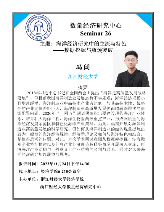冯阔,经济学博士,云顶7610线路检测讲师,硕士导师,研究聚焦于国际贸易理论与政策、产业经济(海洋方向)等领域,现兼任经济理论与可持续发展研究中心负责人、浙江省“八八战略”研究院研究员。先后于《经济研究》、《世界经济》、Journal of Asian Economics等国内外权威杂志发表文章近20篇,主持厅局级、省部级、国家级横纵向课题多项,研究成果获国家级学会、厅局级、省部级等多项科学研究成果奖项,多项研究报告为中共中央办公厅采纳。