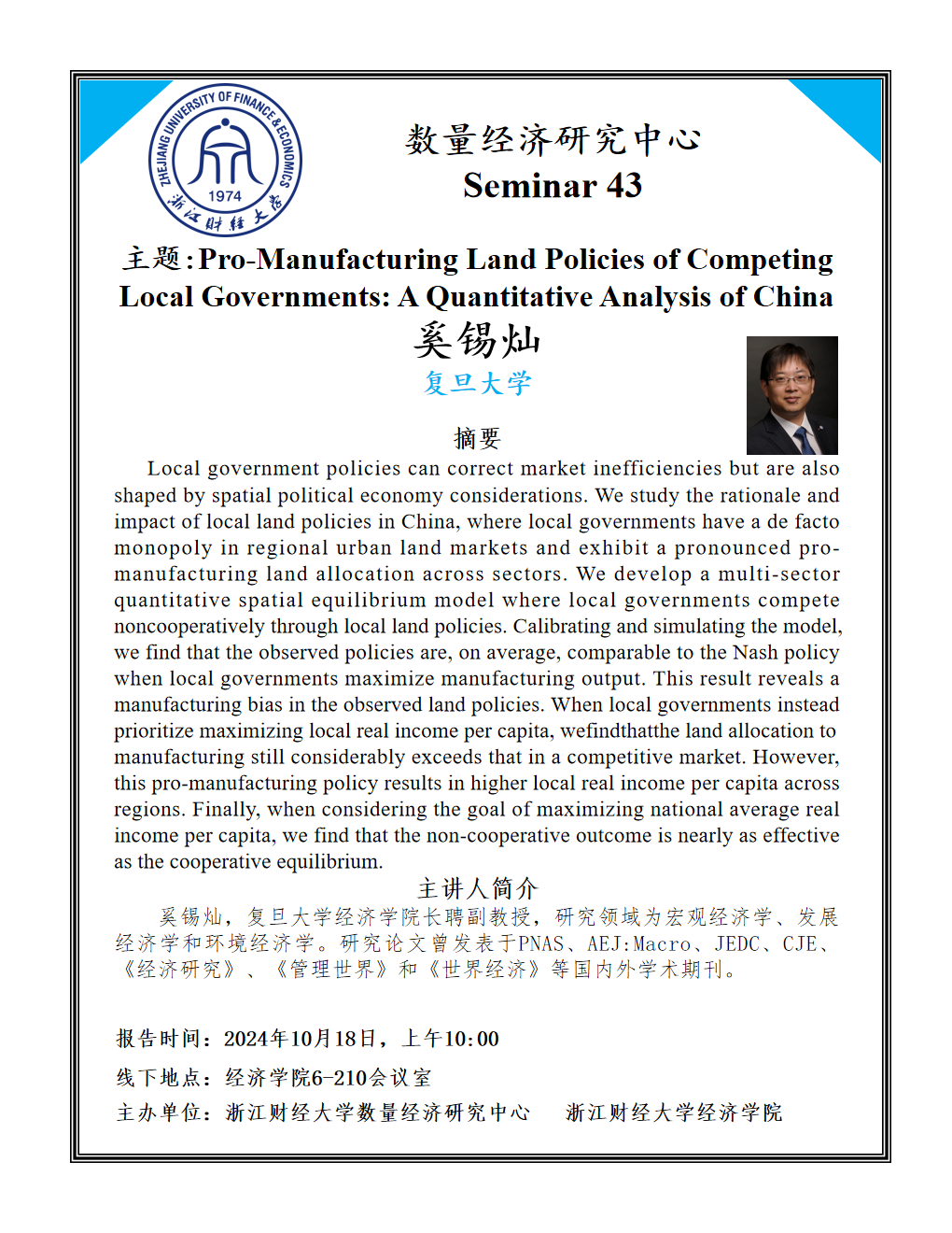 奚锡灿,复旦大学经济学经理聘副教授,研究领域为宏观经济学、发展经济学和环境经济学。研究论文曾发表于PNAS、AEJ:Macro、JEDC、CJE、《经济研究》、《管理世界》和《世界经济》等国内外学术期刊。