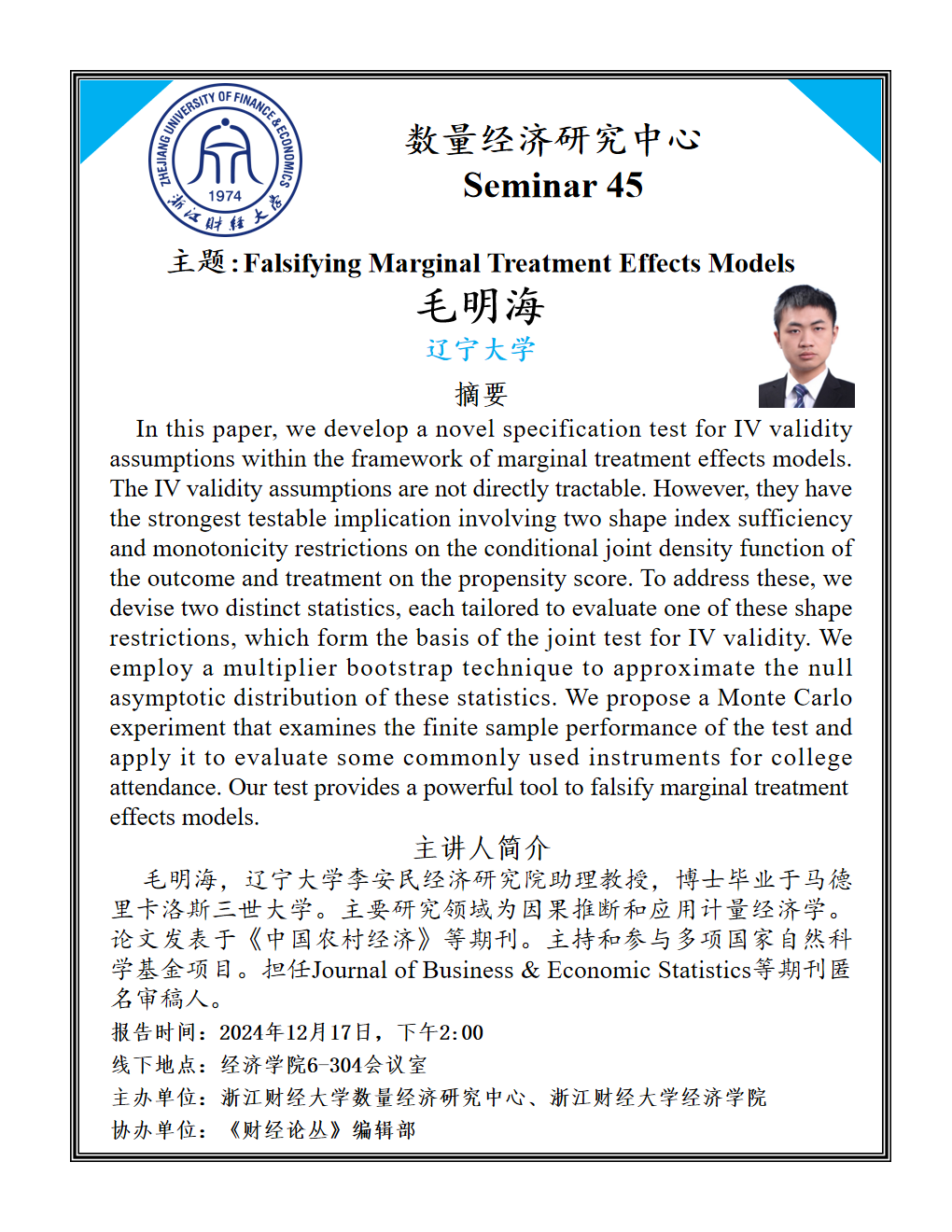 主讲人简介:毛明海,辽宁大学李安民经济研究院助理教授,博士毕业于马德里卡洛斯三世大学。主要研究领域为因果推断和应用计量经济学。论文发表于《中国农村经济》等期刊。主持和参与多项国家自然科学基金项目。担任Journal of Business & Economic Statistics等期刊匿名审稿人。