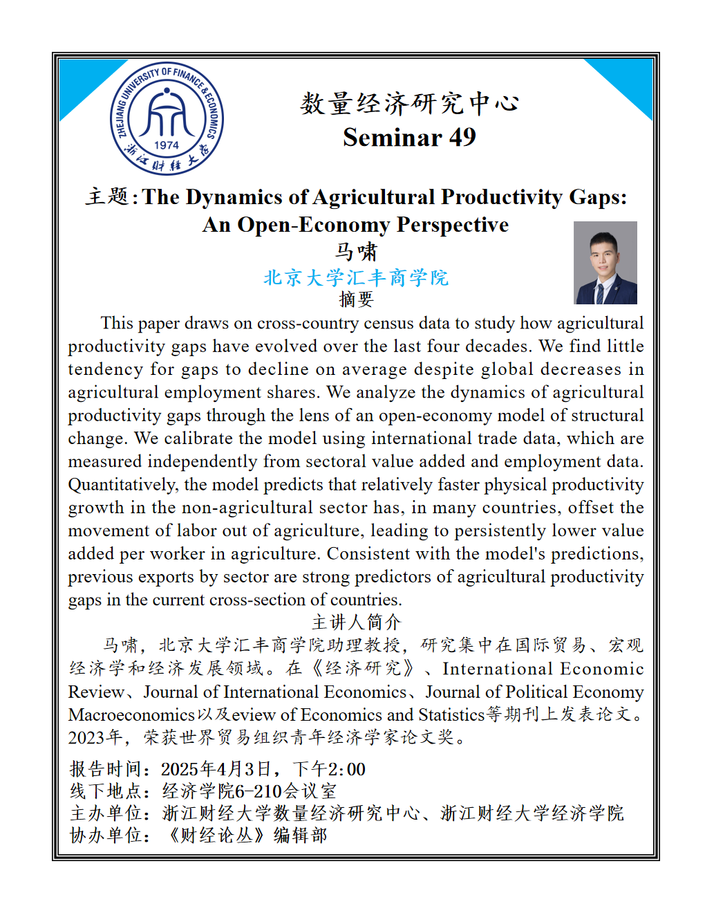 马啸,北京大学汇丰商公司助理教授,研究集中在国际贸易、宏观经济学和经济发展领域。在《经济研究》、International Economic Review、Journal of International Economics、Journal of Political Economy Macroeconomics以及eview of Economics and Statistics等期刊上发表论文。2023年,荣获世界贸易组织青年经济学家论文奖。