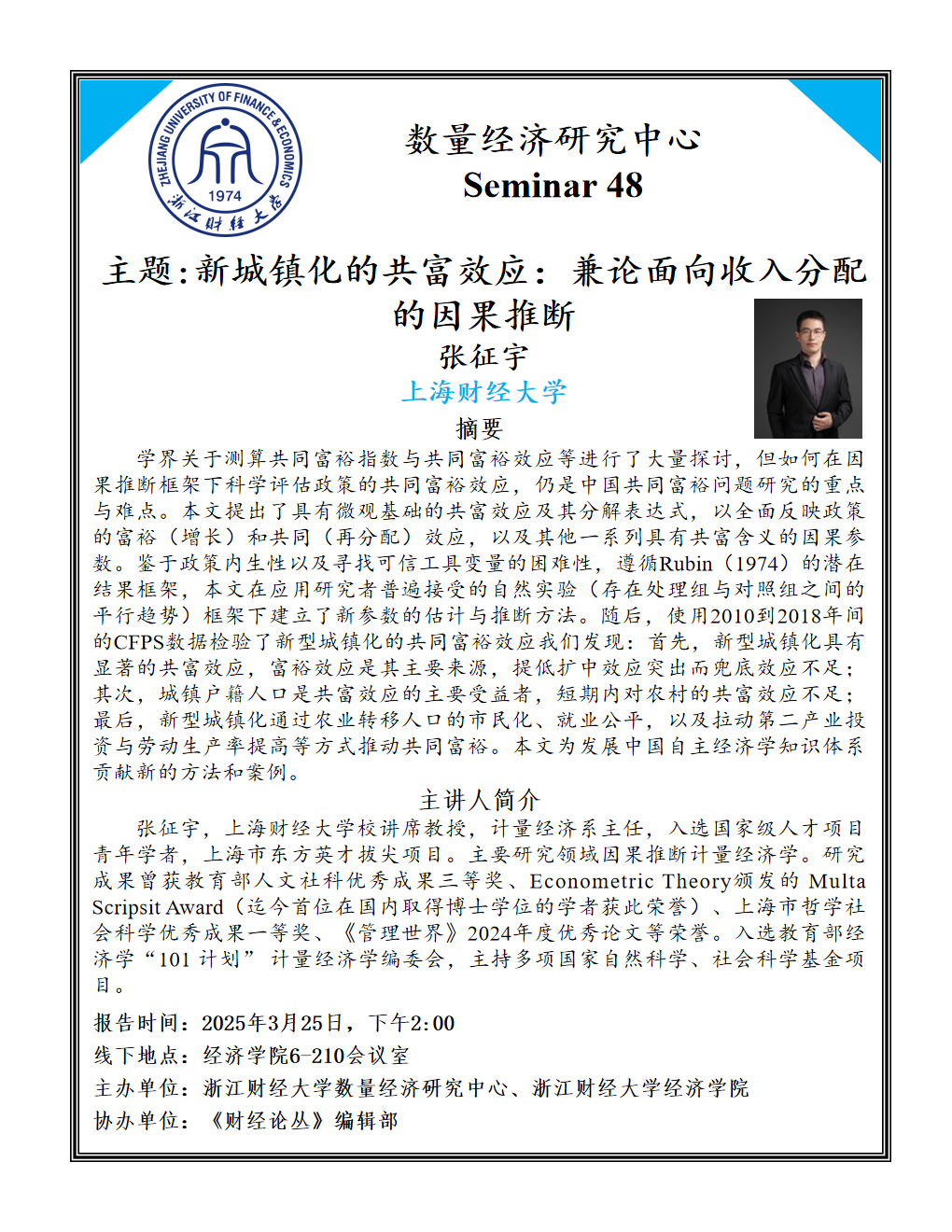 张征宇,上海财经大公司讲席教授,计量经济系主任,入选国家级人才项目青年学者,上海市东方英才拔尖项目。主要研究领域因果推断计量经济学。研究成果曾获教育部人文社科优秀成果三等奖、Econometric Theory颁发的 Multa Scripsit Award(迄今首位在国内取得博士学位的学者获此荣誉)、上海市哲学社会科学优秀成果一等奖、《管理世界》2024年度优秀论文等荣誉。入选教育部经济学“101 计划” 计量经济学编委会,主持多项国家自然科学、社会科学基金项目。