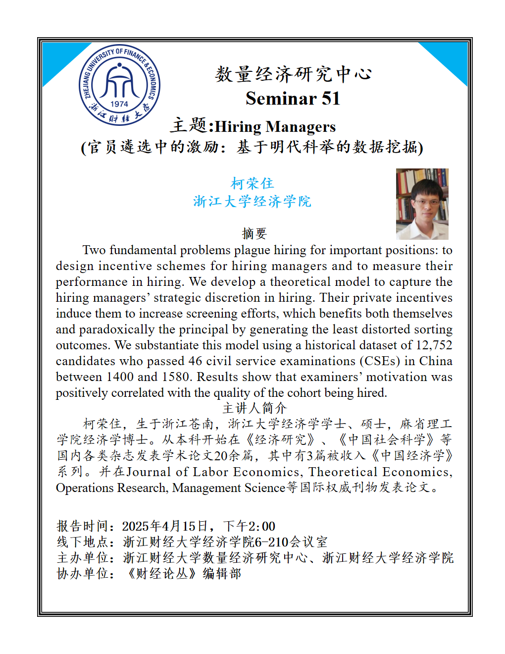 Two fundamental problems plague hiring for important positions: to design incentive schemes for hiring managers and to measure their performance in hiring. We develop a theoretical model to capture the hiring managers’ strategic discretion in hiring. Their private incentives induce them to increase screening efforts, which benefits both themselves and paradoxically the principal by generating the least distorted sorting outcomes. We substantiate this model using a historical dataset of 12,752 candidates who passed 46 civil service examinations (CSEs) in China between 1400 and 1580. Results show that examiners’ motivation was positively correlated with the quality of the cohort being hired.