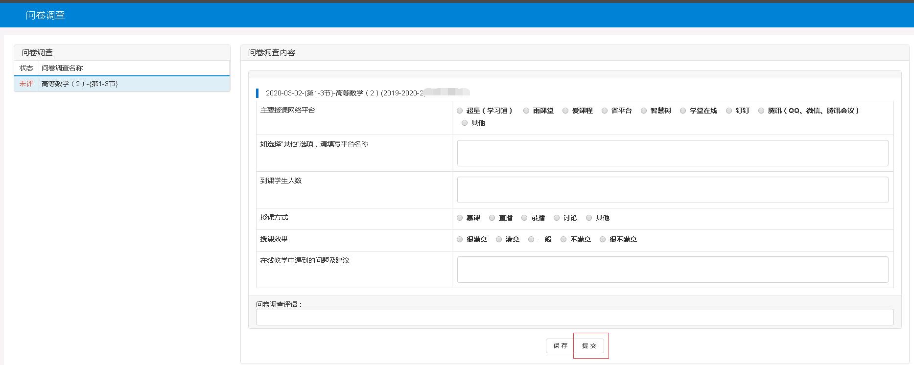 1、教师根据教学大纲要求做好备课和授课工作。由于受疫情影响,本学期初采用在线授课的方式,因此教学检查改为由教师和员工各自反馈。教师教学反馈操作方法如下:每次课结束后教师登录教务系统反馈授课情况(当日完成),教务处将根据教师填写的数据于次日汇总上报教育厅。操作路径:教务系统——教学评价——问卷调查。