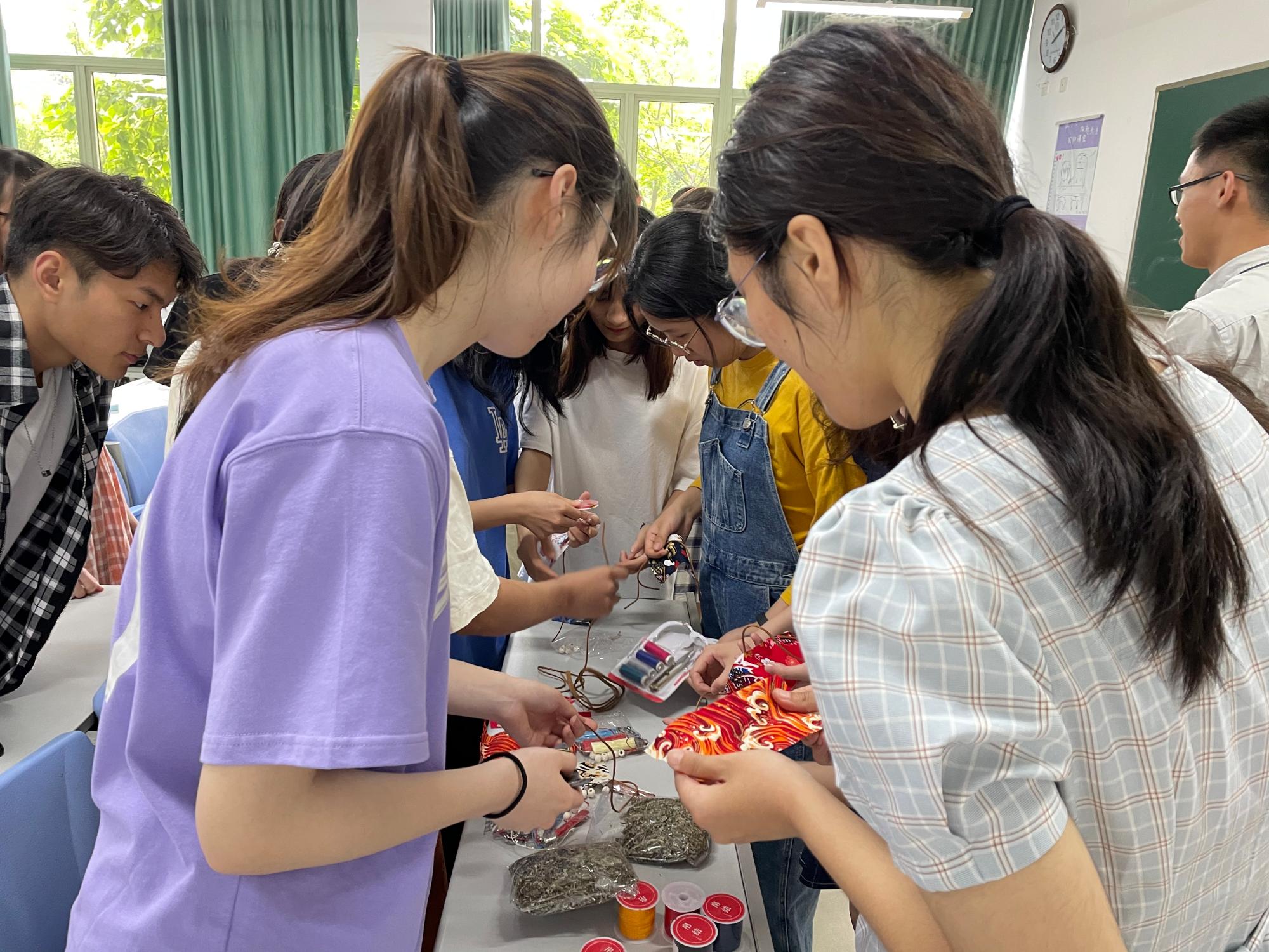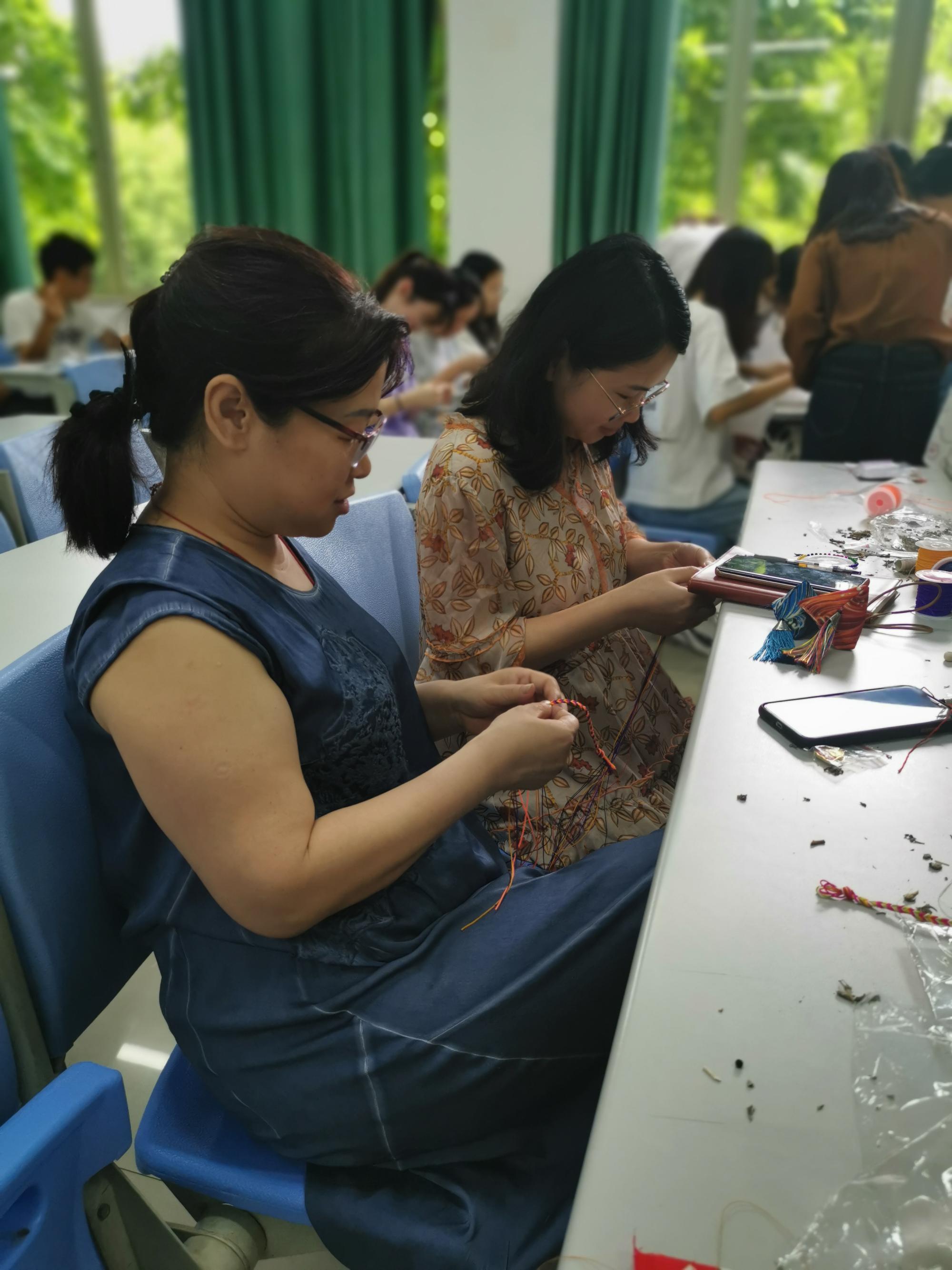 活动在教工第二党支部书记赵卓嘉老师的党课分享中开始。她指出,要从百年党史中汲取奋进力量,强化目标管理,争做时代先锋。随后,师生党员们跟随着视频教程,一起做香囊、编五彩绳,感受端午民俗文化。桌子上的五彩珠、彩绳、丝线、布料、挂饰配线以及中草药等材料一应俱全,师生党员们各自选样后便开始按照步骤有条不紊地进行香囊和五彩绳的制作。在其乐融融的氛围中,一个个精美的香囊、一根根绚丽的五彩绳在他们手中诞生。