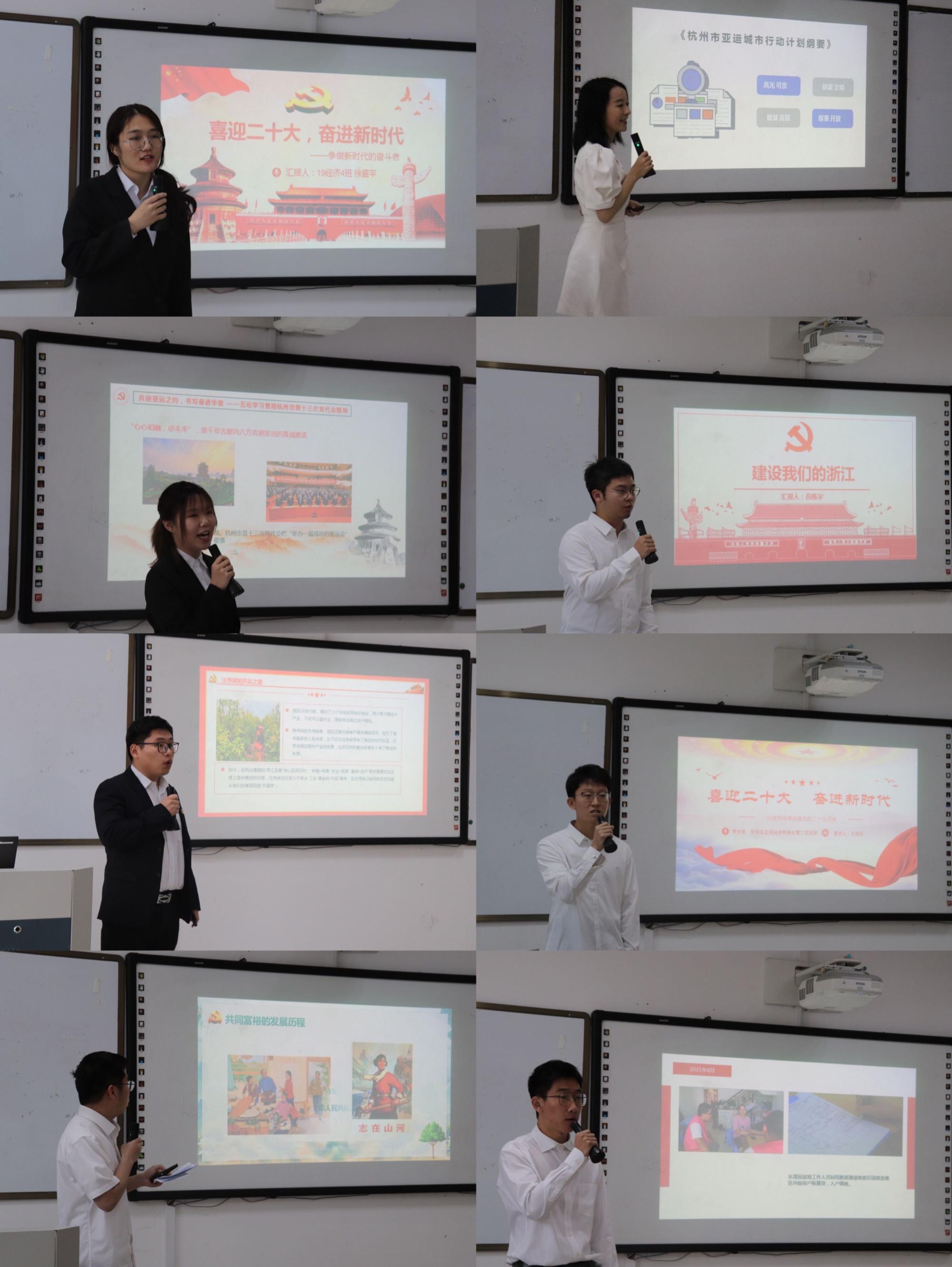 来自各党支部的八组选手,紧扣“幸福”、“拼搏”、“创新”、“奋进”四个关键词,从共同富裕、亚运精神、数字化改革、奋进新时代等方面,讲理论、讲观点、讲故事,用饱满的热情、鲜活的事例、生动的语言为同学们带来了精彩的微党课。此次微党课的内容丰富,形式多样,引导青年学子从党的百年奋斗历程中不断汲取智慧和力量,努力做一名积极向上、昂扬向前的新时代奋进者。