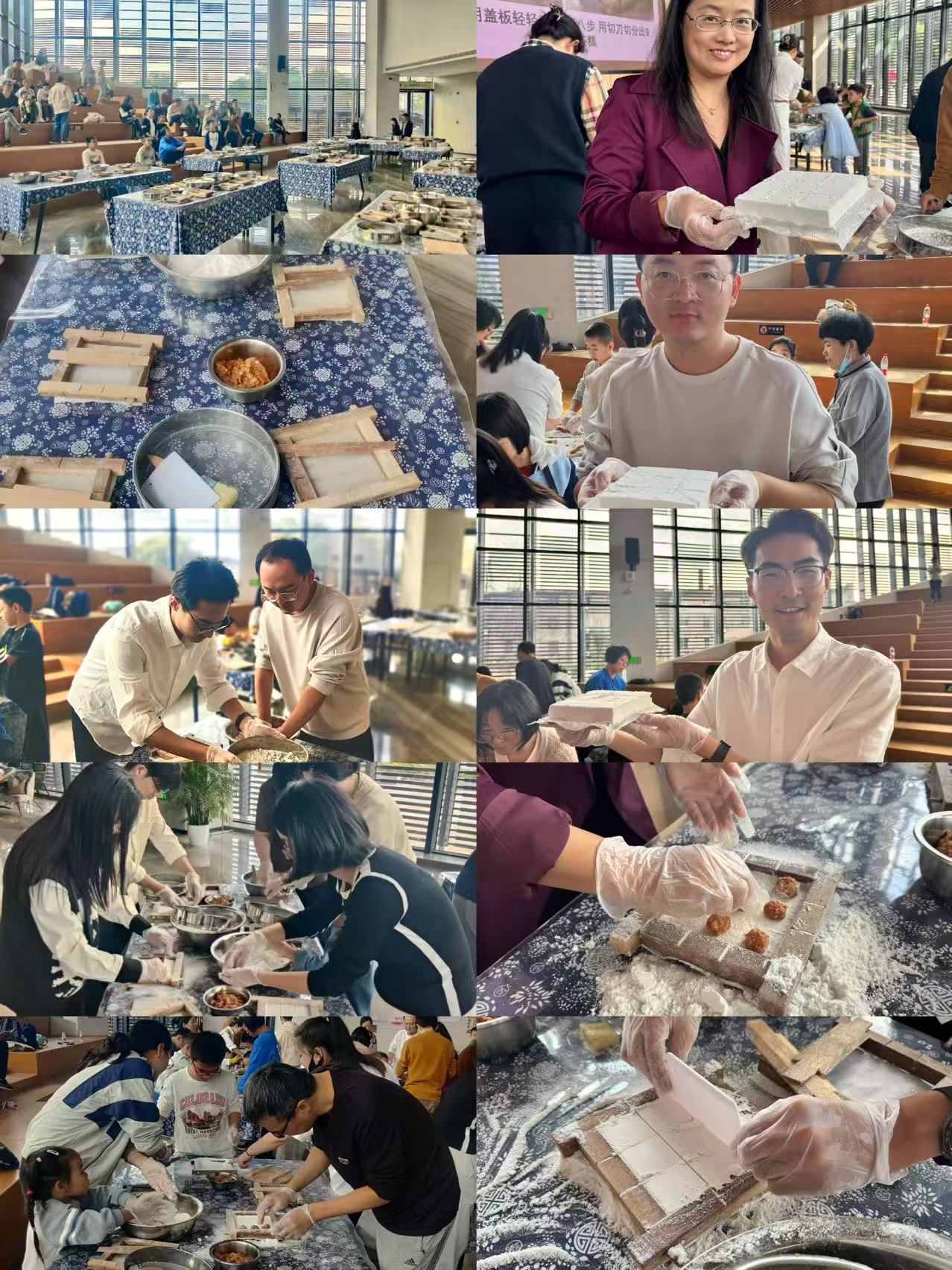 新市古镇不仅风光旖旎,更以其丰富的非物质文化遗产,尤其是传统美食制作技艺而闻名。午饭后,老师们前往体验制作湖州市非物质文化遗产——茶糕:茶糕的历史可追溯至南宋时期,其松柔、鲜香、糯软的独特口感,历经岁月沉淀愈发醇厚。大家在专业师傅的耐心指导下,亲手揉制面团、调配馅料,再将它们精心包裹、放入蒸笼,由专业师傅帮忙蒸熟。从糯米粉的筛选、馅料(多为鲜肉)的调制,到入模、蒸制,每一步都凝结着代代相传的匠心。大家品尝了刚出笼的热气腾腾的茶糕,外皮软糯,内馅鲜美,其独特的口感与风味赢得了阵阵赞叹。
