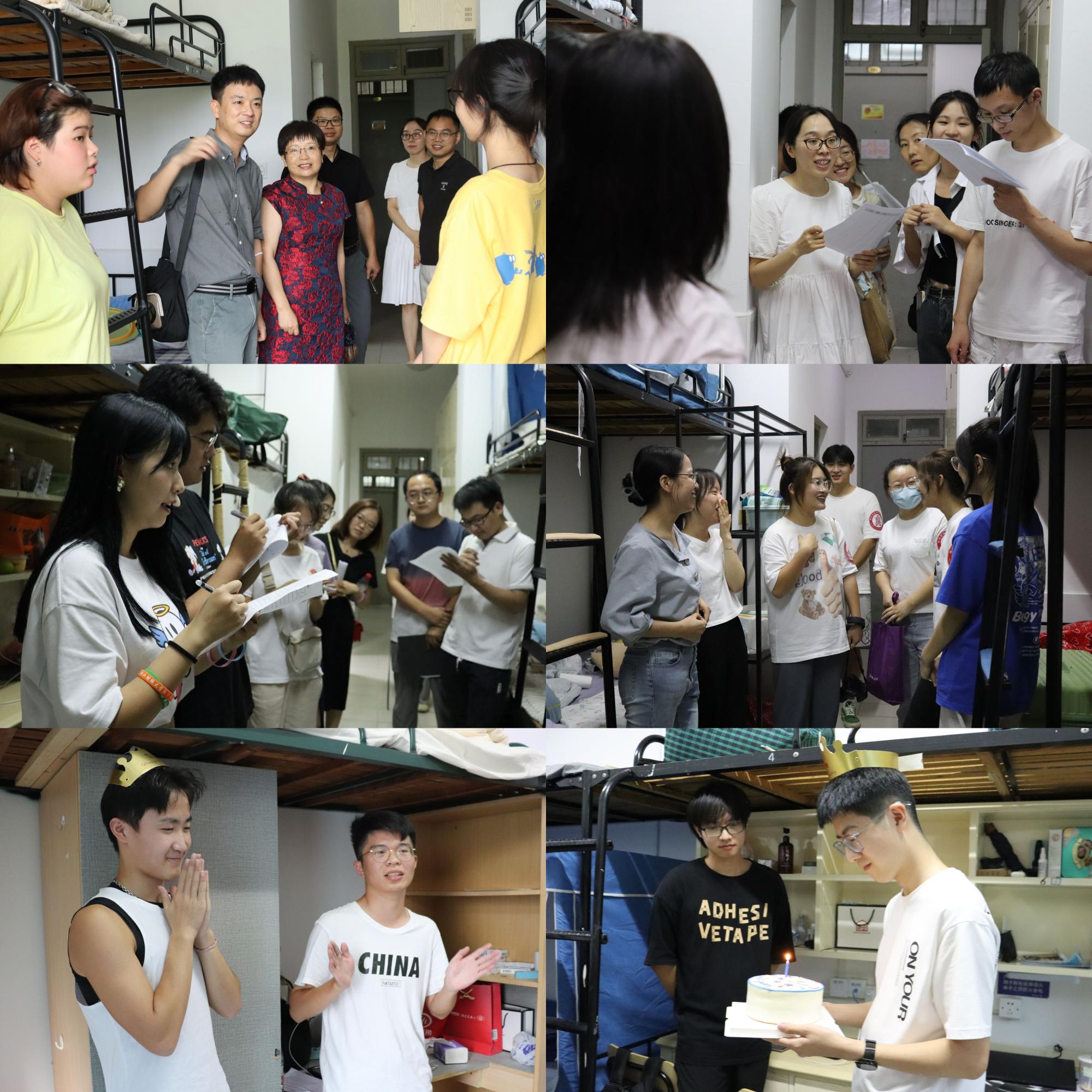 当天,公司全体领导班子、新生班主任、辅导员以及各班班导一行走访新生寝室,了解他们的生活情况,并叮嘱同学们调整作息,以良好状态迎接军训到来。师生还与当天过生日的两位新生共同庆祝,现场气氛温馨愉快。